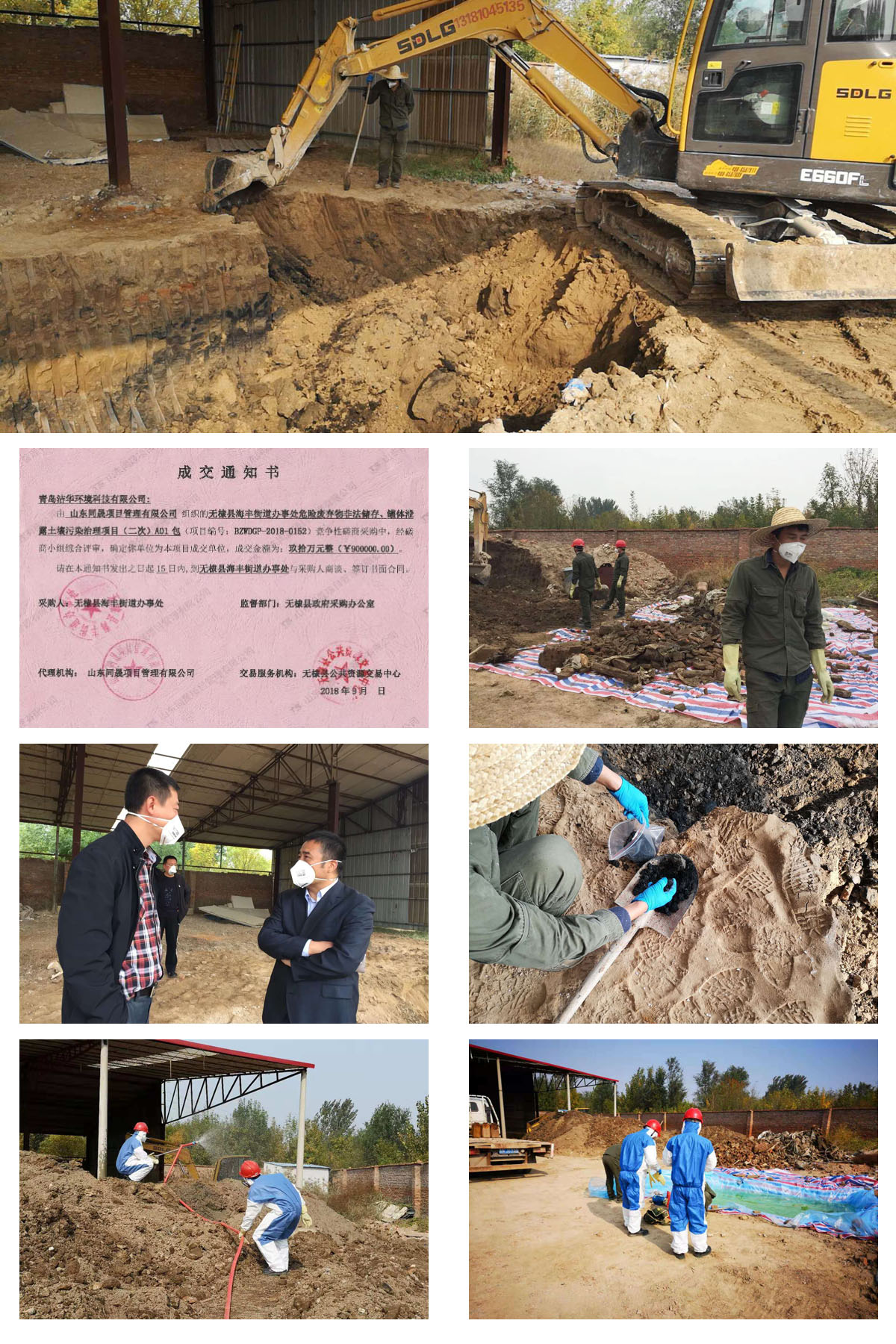 2018年9月27日与山东省滨州市无棣县海丰街道办事处签订该办事处代家村合同金额为90万元的危险废弃物非法储存、罐体泄露土壤污染治理项目,仅用时70天完成该项目污染土壤186方约240吨及残留的1.5吨废弃危险废物桶的治理,并协助当地环境保护主管部门参与到该项目法律诉讼之中。